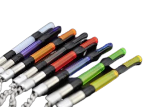 These are ready-to-go indicator systems that are available in all eight colours. You get a head with weight, magnetic hockey stick and TWO chains. The reason that the kits are supplied with two chains is so that you can use your indicators with any type of conventional bite alarm. The chains with short steel extensions are suitable for Delkim-sized alarms, whereas the chains with long extensions are for smaller, Neville-type alarms.
